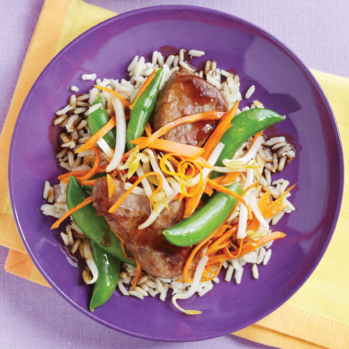 Directions: Prepare rice according to package directions. Meanwhile, fill a medium pot halfway with water and bring to a boil. Add peas, reduce heat to a simmer and cook for 5 minutes; drain and set aside. Heat oil in a large saucepan over medium heat for 1 minute. Add pork and cook for 3 minutes. Turn over medallions, add carrots, garlic and ginger, and continue cooking for another 3 minutes. Swirl in soy sauce and vinegar, scraping bottom of pan to deglaze it. Cut open a medallion to make sure that pork is cooked through. If not, continue cooking for 1 more minute; check again. Remove pan from heat. Stir in orange juice, sprouts and peas. Toss pork mixture with rice and serve.