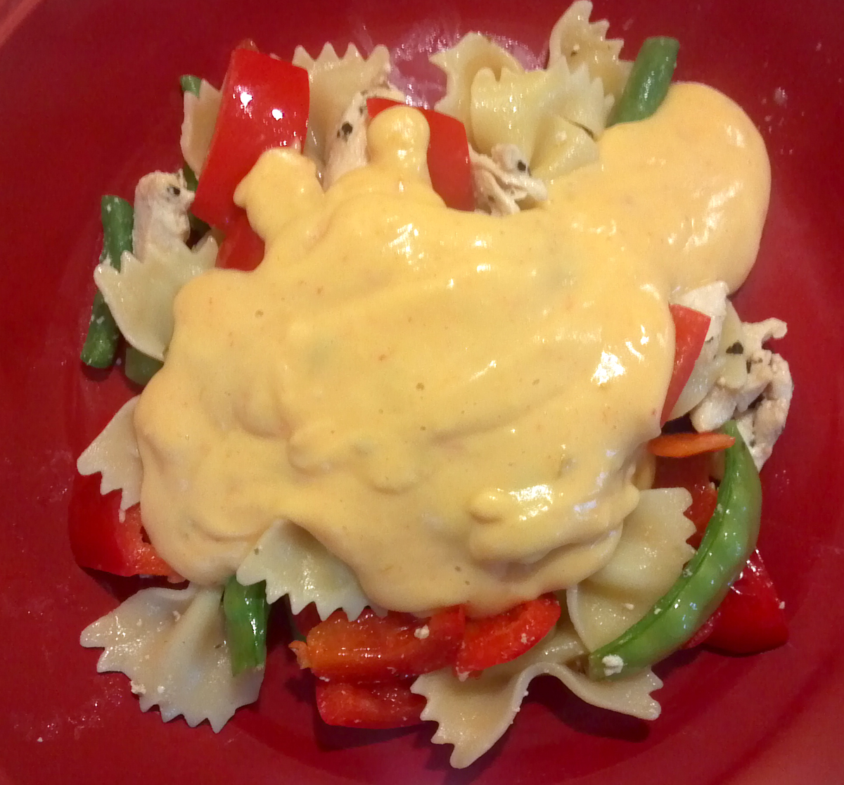 Sometimes, I’ll start with a clean dish and just feel that I need to give in and dirty it up a little. Which is what happened last night. I was cooking my pasta. Frying my chicken with Italian seasonings. Boiling my snow peas and snap beans from my garden and frying up some red peppers when I wanted spicy. So I made my own cheese sauce with salsa con queso. It was delicious – and only slightly dirty.