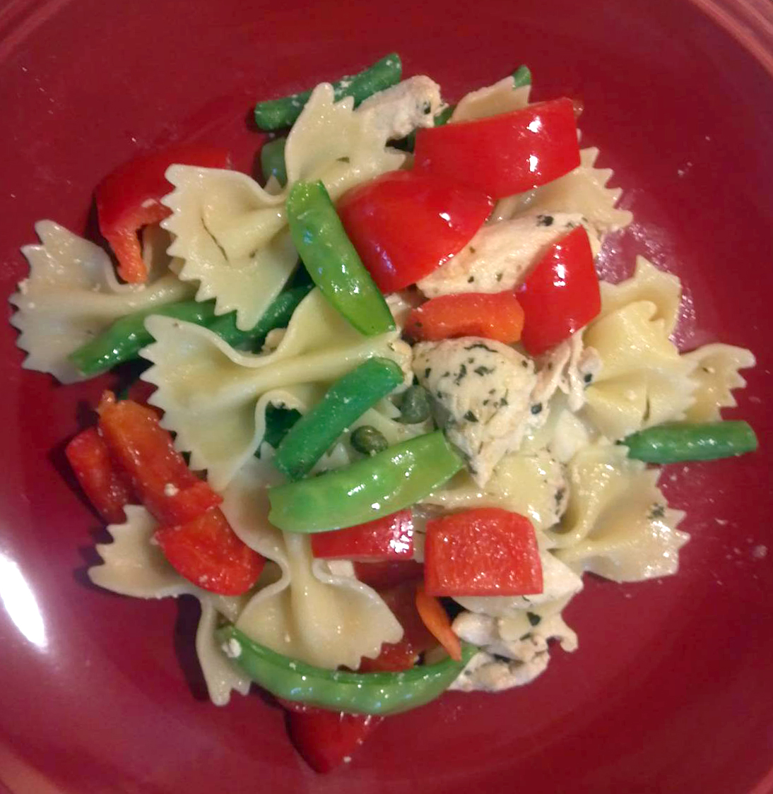 used for pasta, boil snap beans and snow peas in their shoots. Strain and add them to strainer your pasta is in. Once chicken is fully cooked, add in with pasta and greens. Dice the red pepper, cook on medium-high for about 4 minutes. Add to strainer with rest of ingredients. Add capers, toss with tongs. Ready to serve if you’re looking for a “clean” meal.