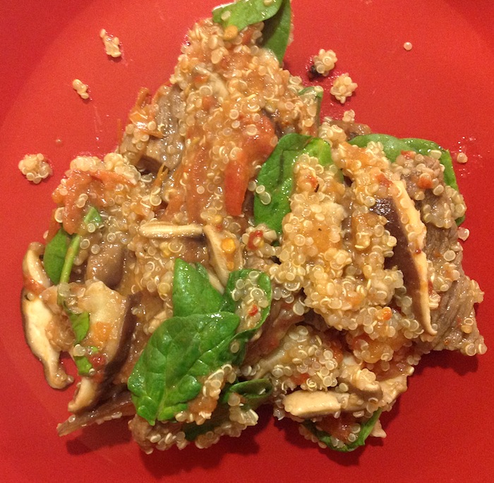 I was in the local market today, just down the road from my house, and found myself staring longingly at the fresh cut steaks in their deli. I quickly did a tally of the other things I had in my basket, shiitake mushrooms, fresh tomatoes and a few handfuls of fresh baby spinach. I remembered grabbing about a pound of undyed quinoa over the weekend from our co-op and knew that a protein filled dinner was in the making. I just needed a slab of steak.