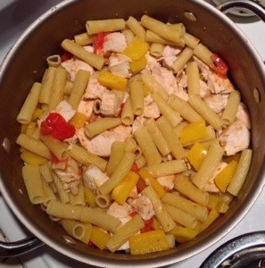 - In a large mixing bowl, combine your pasta, chicken and any toppings you’d like to add. Mix well.