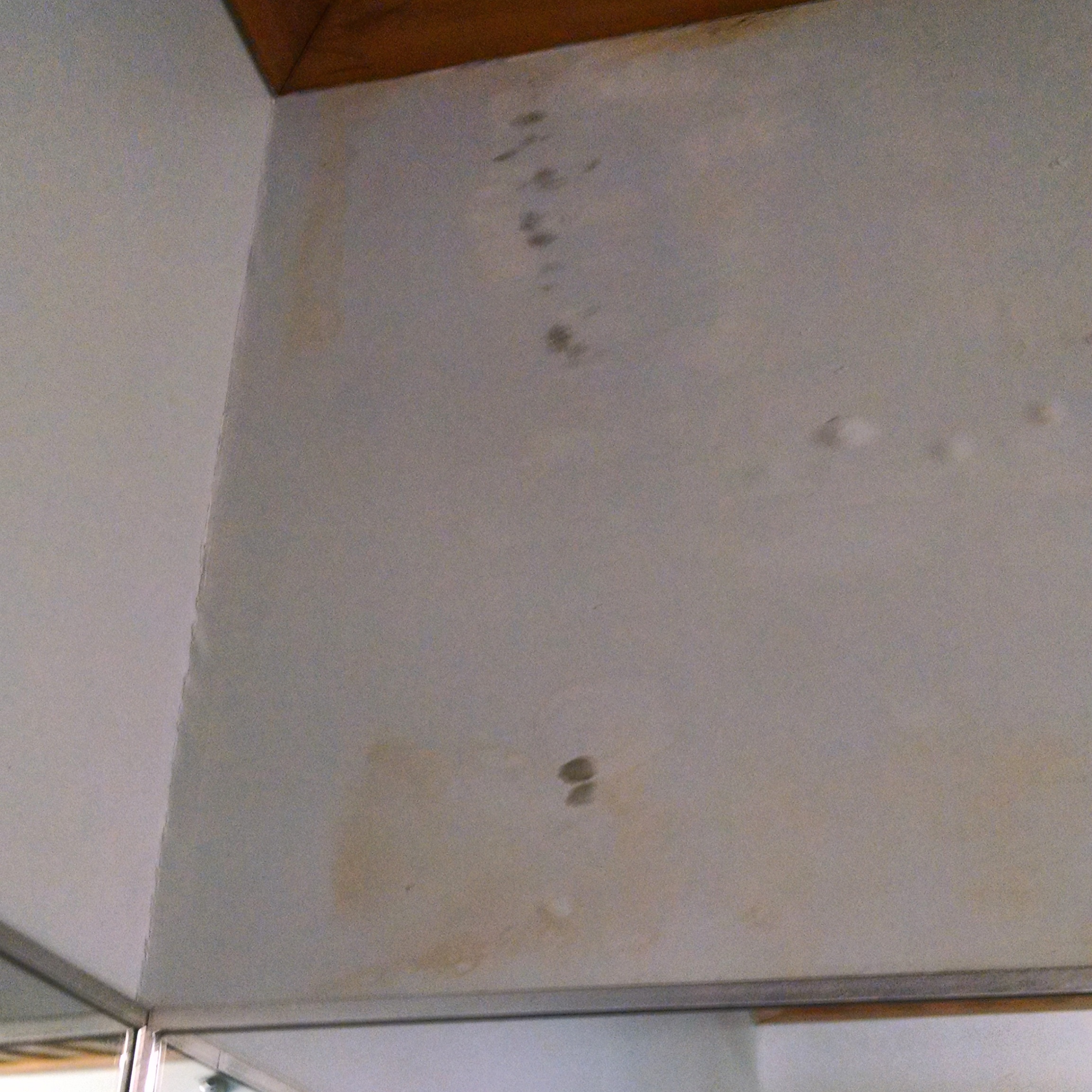 The leak down from the roof, through the second floor, to the first (where this photo was snapped), has gone without repair for so long, that it’s no longer able to hide just how bad it is. (It’s also not the only place that leaks).