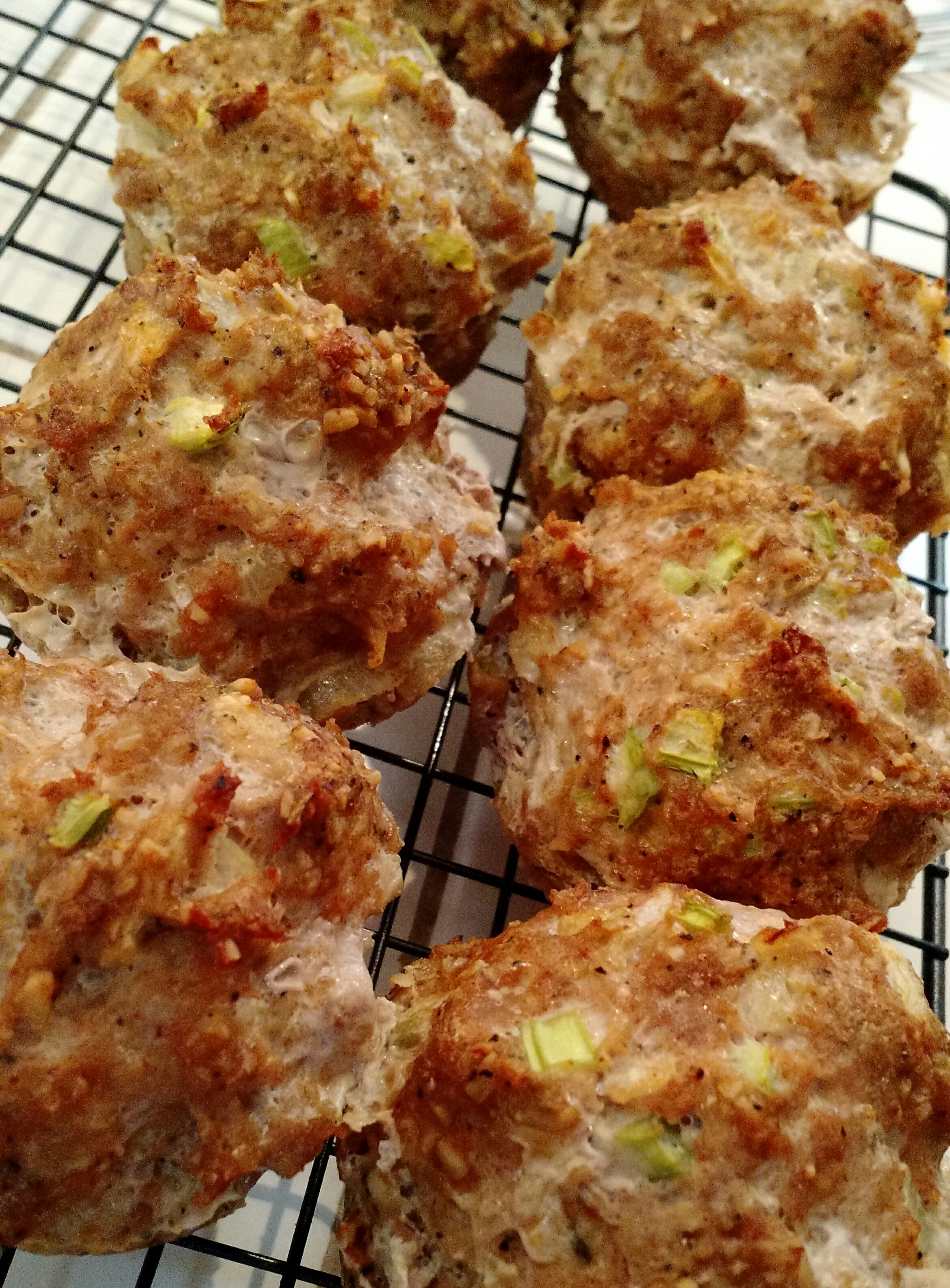Directions: Preheat oven to 375-degrees. Spray muffin pan with olive oil, then mix all of your ingredients together in one large bowl. Roll mixture into balls and put them in the muffin pan (muffins should be the size-ish of a racquetball). Bake for 40-minutes. The recipe makes 12, but I got a baker’s dozen of good sized muffins.