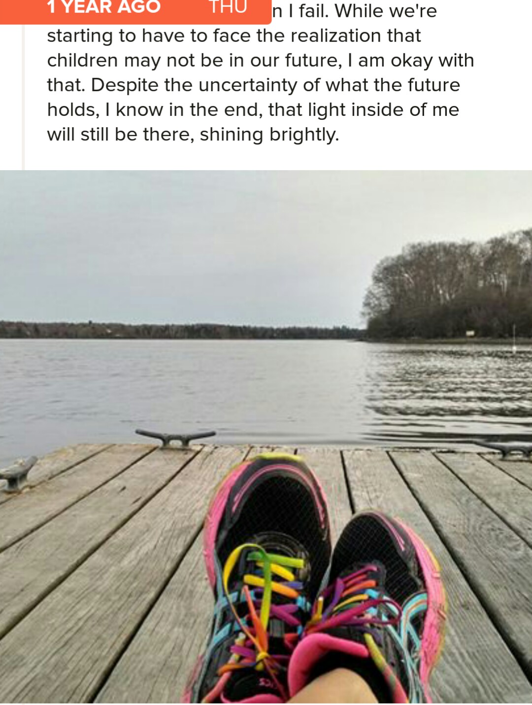 Mine for today was a post to Facebook a year ago. The day I sat on that dock with my dog, and came to peace fully, on being told that even with the medical intervention of In Vitro Fertilization, the chances of me being able to have a child were only 30%. I had always thought that I was okay with whatever happened. I truly believed that I was okay with or without being able to be a mom. But that day, I realized I wasn’t fully okay with whichever way the wind blew.